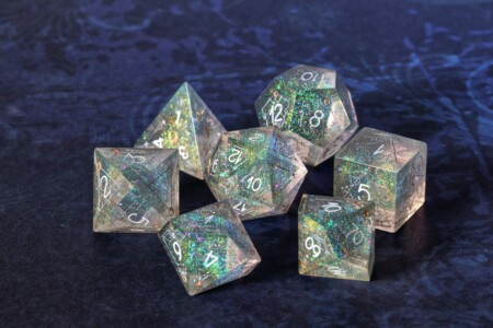 Released in the last quarter of 2019, FanRoll came out with a new line they call Flash Dice. And while the iridescent flakes inside are a lot coarser than any of the Chessex Borealis dice, they still create a wonderful shimmery effect that is perhaps just as stunning as Borealis Confetti.