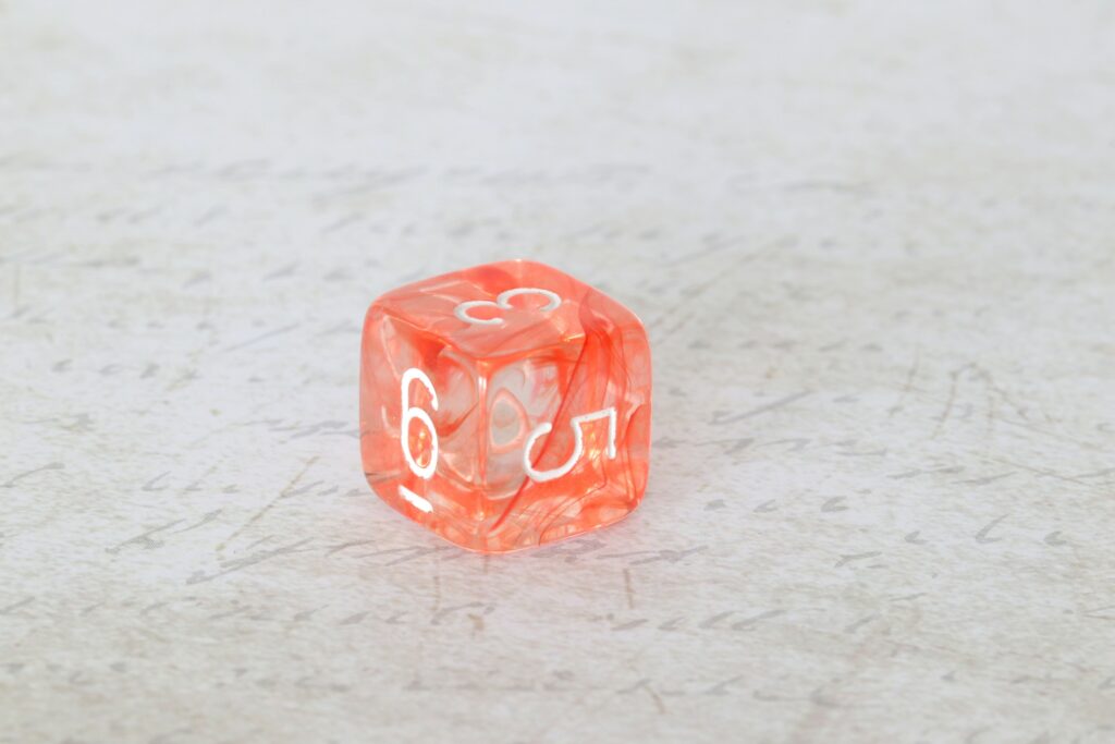 A bunch of old German acrylic mould translucent neon dice. My camera isn’t good with orange colours, so trust me when I say these are indeed a bright neon orange. The one in the back is a more pink-ish shade and the yellow one is neon yellow.